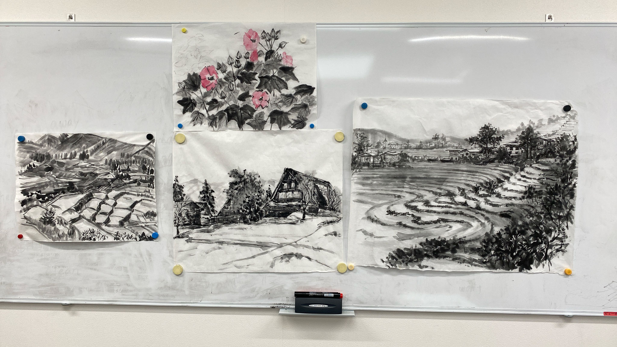 最近は雨の日も多くなり、ひと雨ごとに少しずつ秋の気配も感じられるようになってきました。 黄墨会のみなさんは熱心な方も多く、教室には自分の描きたい絵を練習されて持って来られる方も多いです。 この日の教室では、以前先生も描かれた星峠の棚田風景、白川郷風景、ミャンマーの棚田風景、 芙蓉の絵が並びました。...